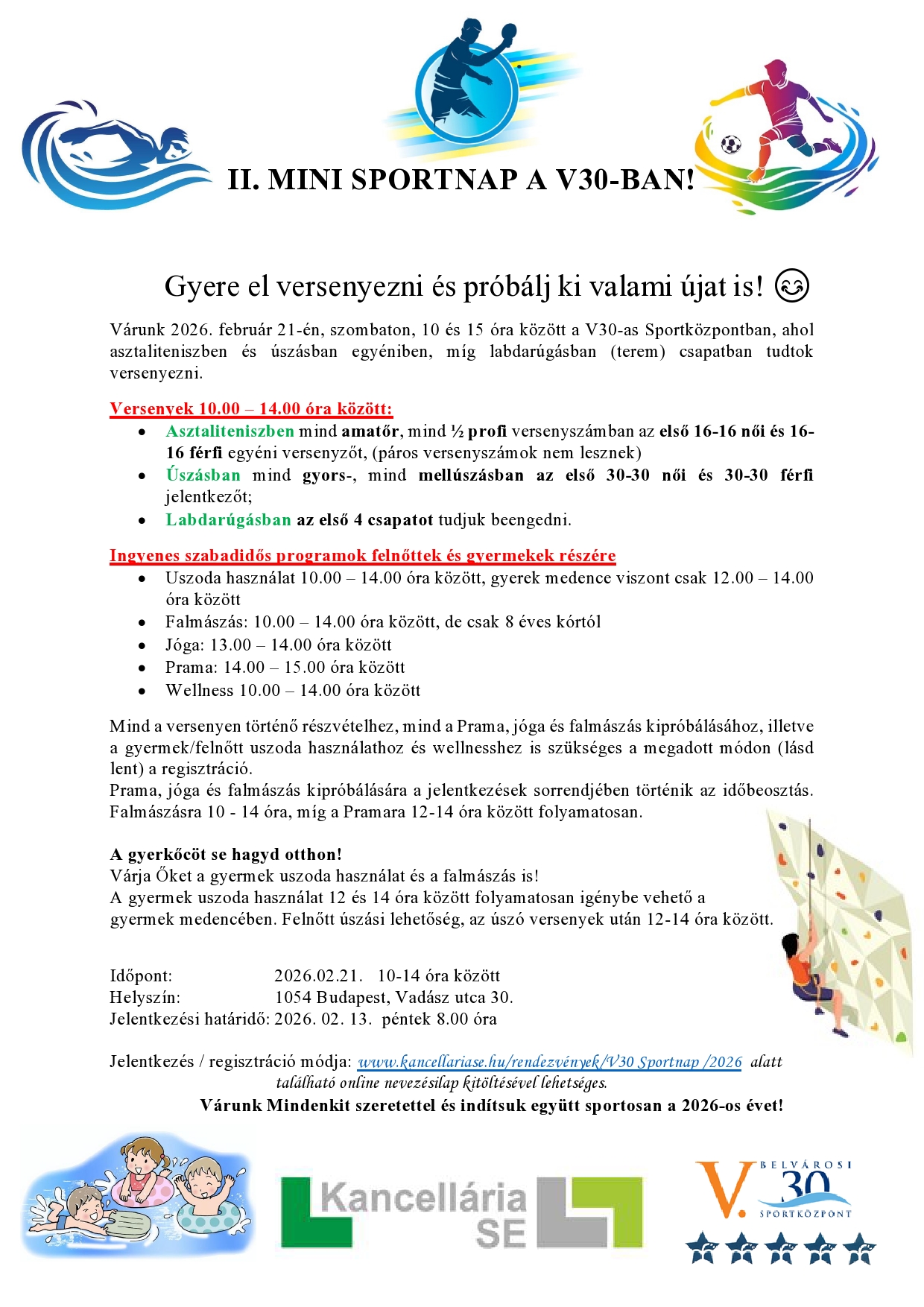 A Kancellária Sport Egyesület szervezésében kerül megrendezésre a II. V30 Mini Sportnap, amely kiváló lehetőséget kínál a sportos kikapcsolódásra, a közösségi élményekre és az aktív feltöltődésre.